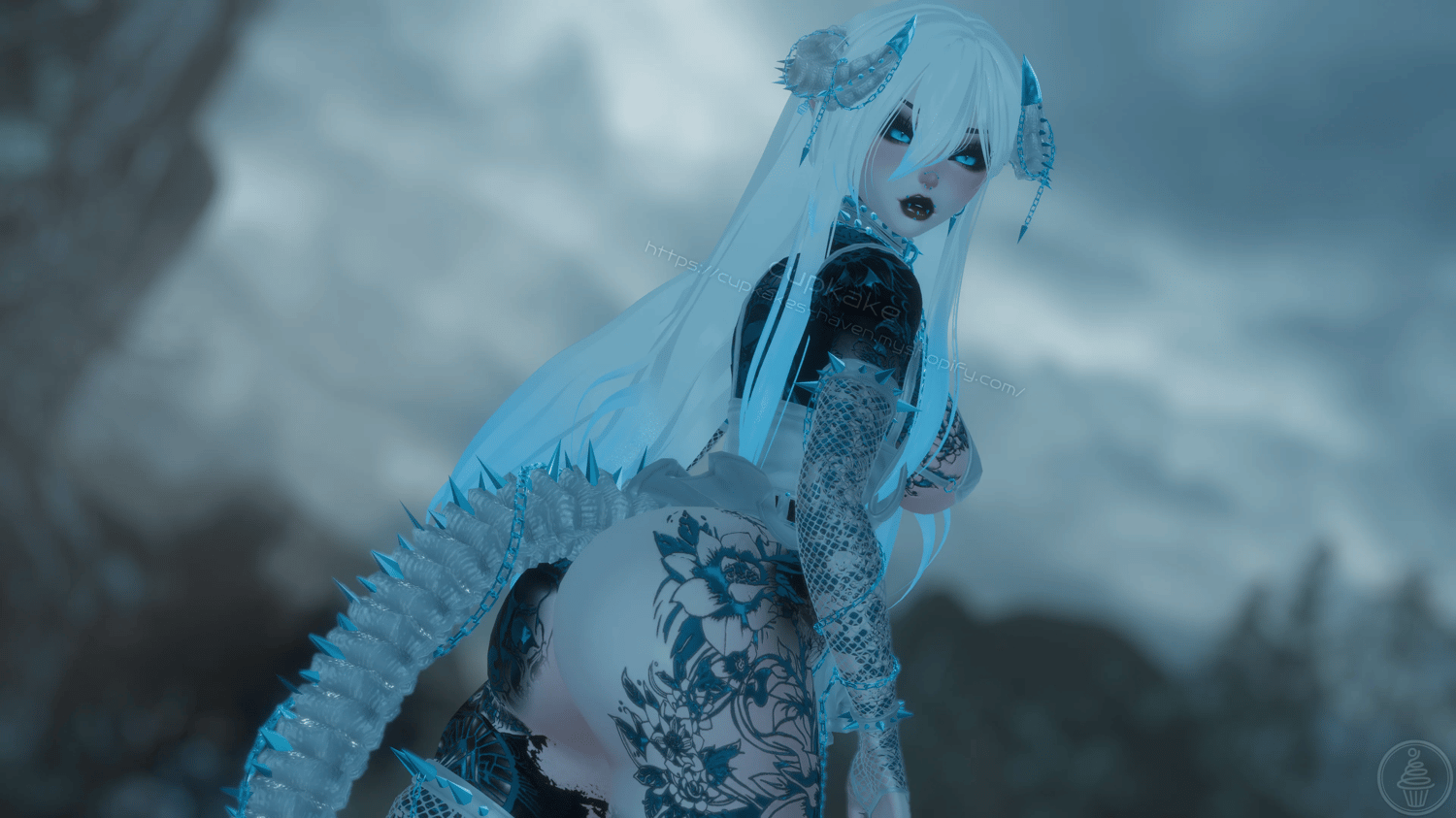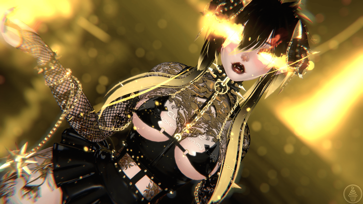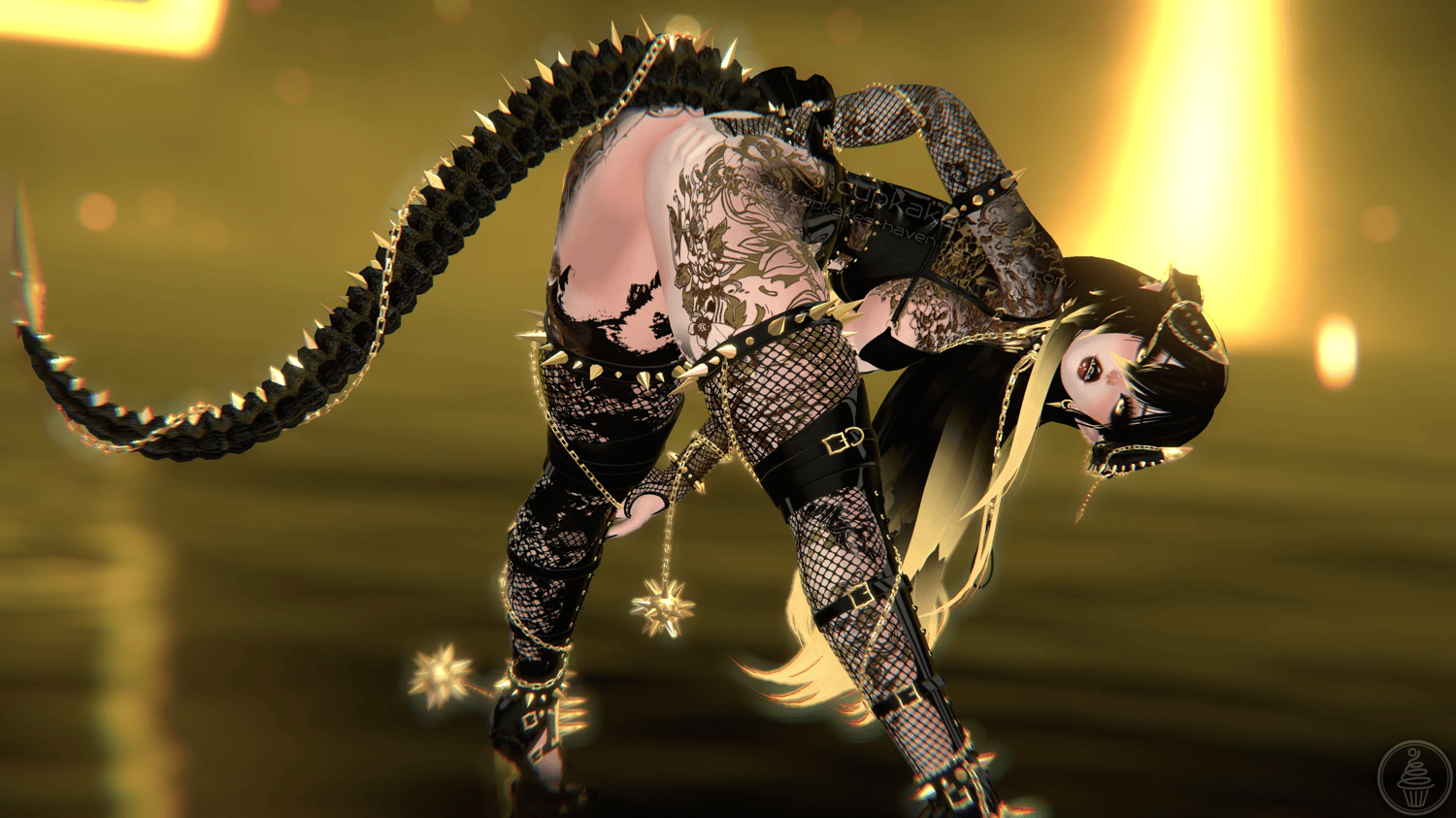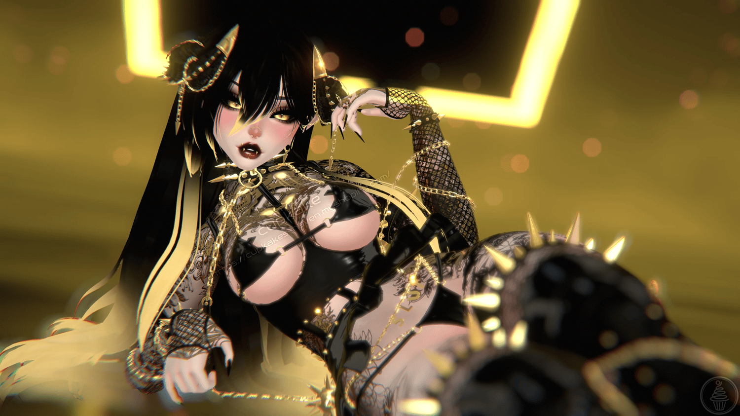 Assets made from scratch by me(Cupkake): Horns/Tail, Mask, Choker+Leash chain, Corset top, Skirt, Bra, Panties, Pasties, Gloves, Socks, All spikes/Spiked accessories/Chains/Ballchains, Face/Body piercings, Ballgag, Wiggly tongue