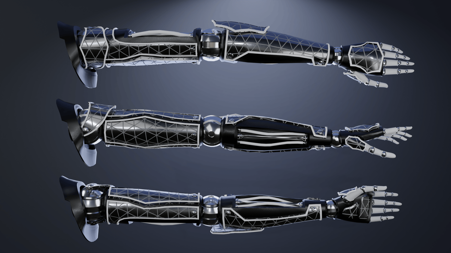 From scratch made (unisex) mechanical cyber robot arm by me. Comes with 1 FBX file containing the arm(45,8k polys), and 4K custom made PBR textures(Base color/Normal maps/Roughness/Metallic/AO). All rigged, only includes the left arm (can be easily flipped to be the right), fit and proportioned to fit Pandaabear's female base.