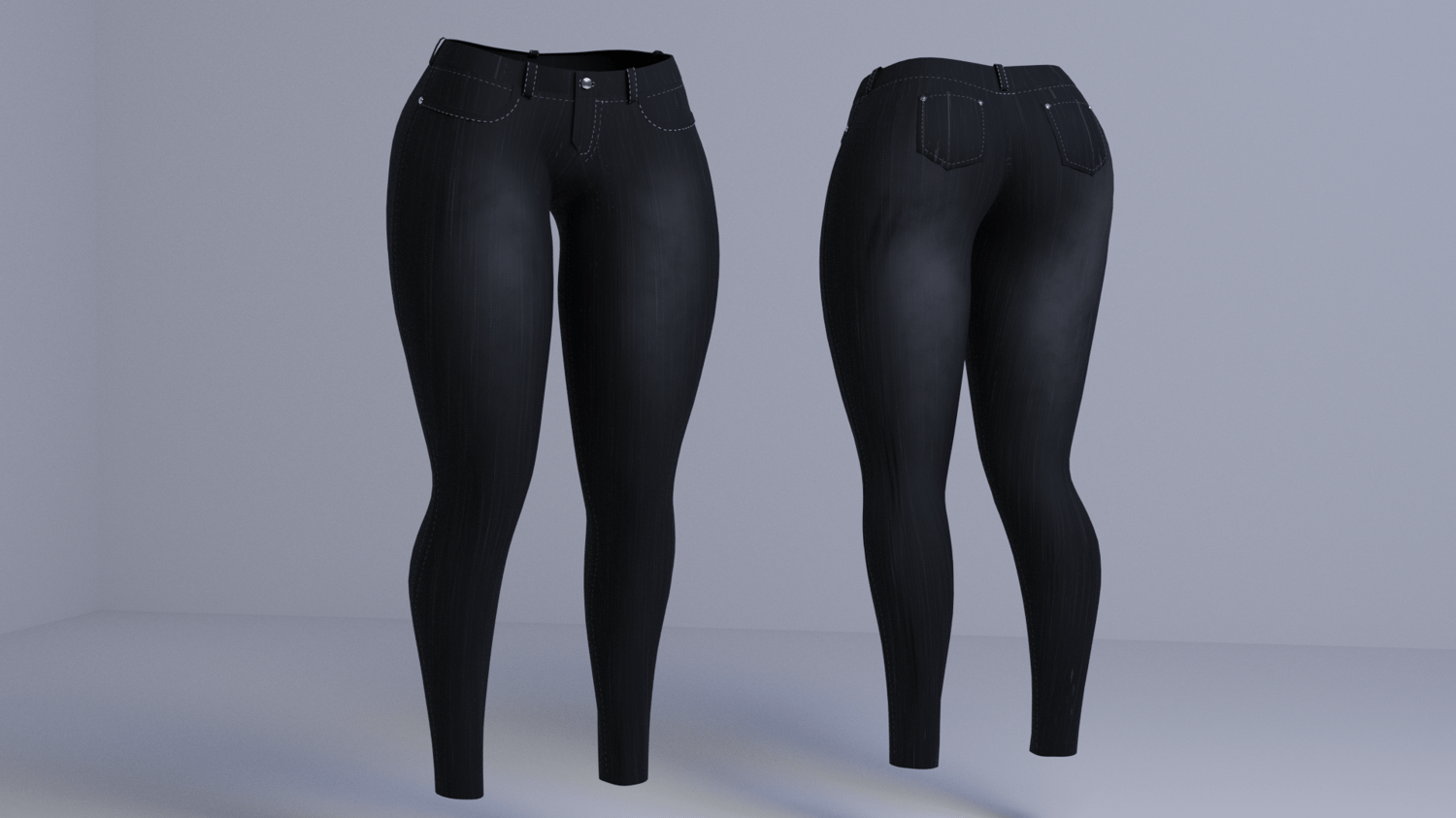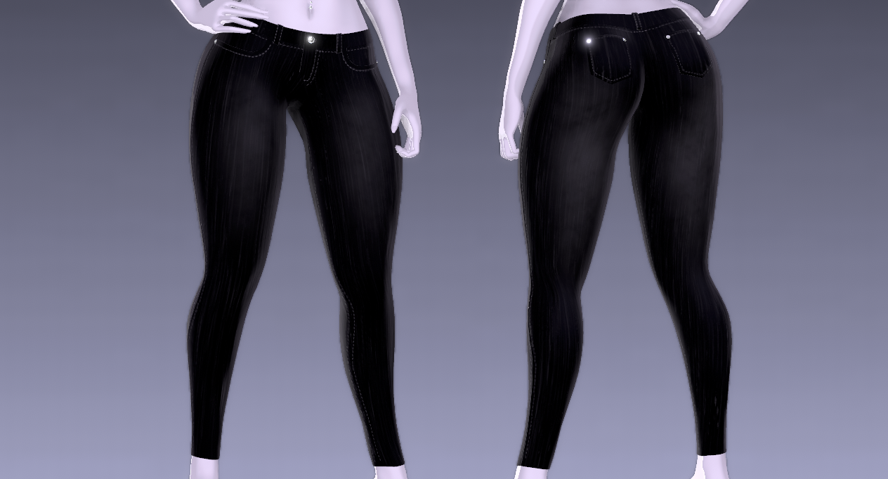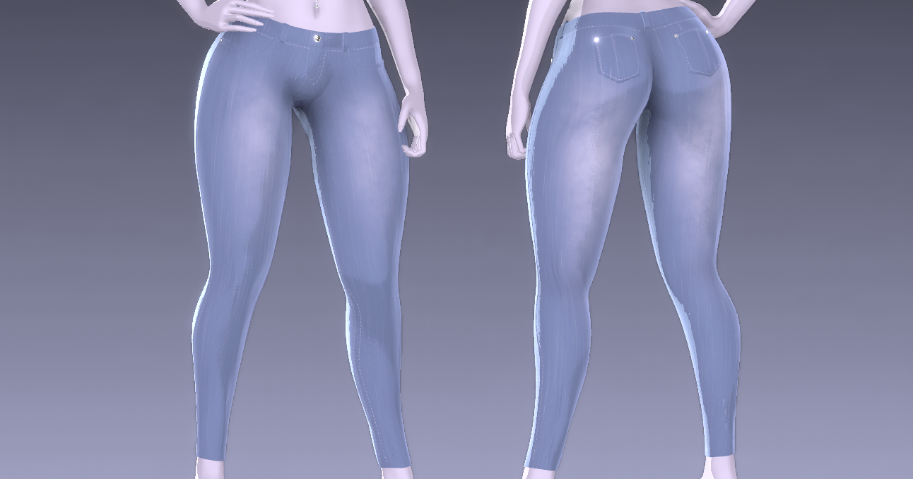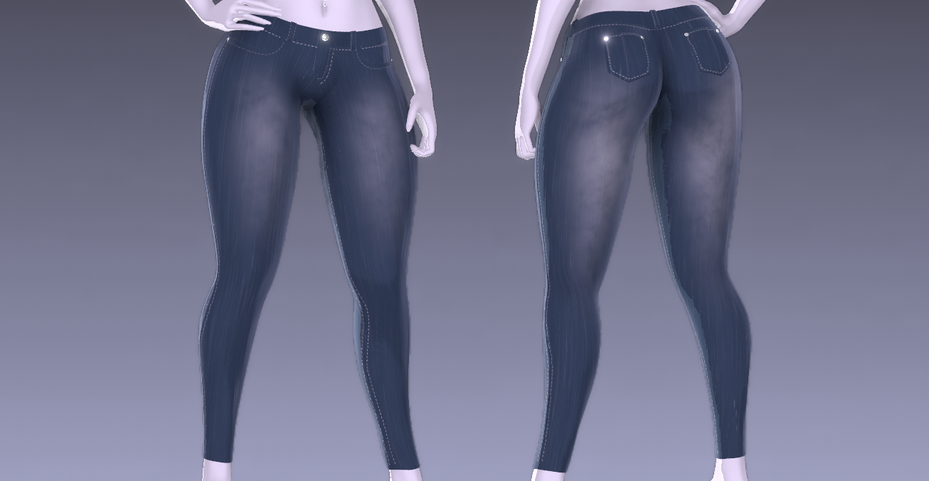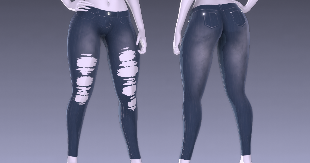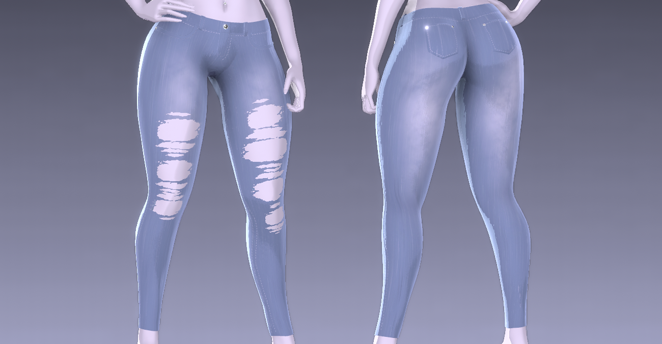 From scratch made (unisex) skinny jeans by me. Comes with 1 FBX file containing the jeans, and 4K custom made textures(3 color variations - Ripped jean + Normal jean for each) + roughness map + normal map. Rigged to my edit of Pandaabear's female base. (Unisex can be achieved with simply resculpting them to fit the body you want)