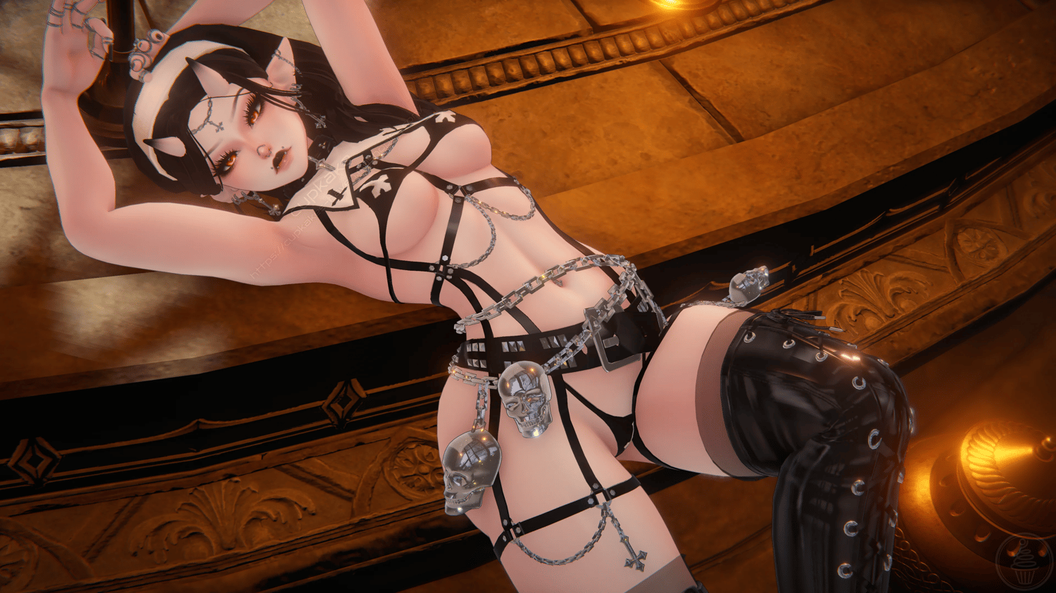 Assets made from scratch by me(Cupkake): Face Veil, Nun collar, Skirt, Gloves, Socks, Bra, Panties, Pasties, Harness, Belt, Horns, Tail, Elf ears, Skulls, All Chains, All crosses, All piercings, Wiggly tongue